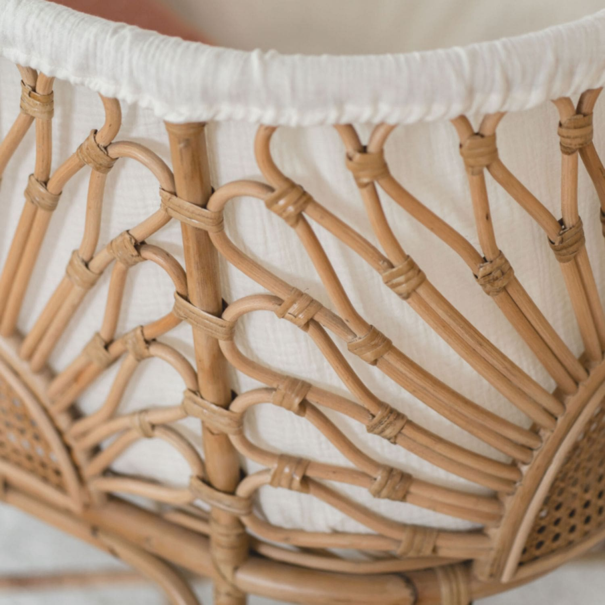 Vendu avec son pied en rotin fixe, son matelas (40x 80 cm ovale) et son tout nouvel habillage en double gaze de coton écru pour encore plus de tendresse.