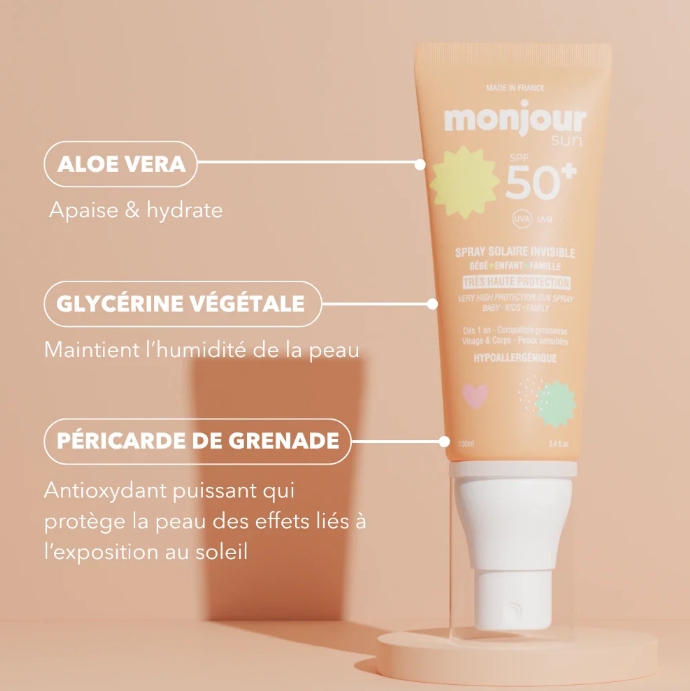 Le Spray Solaire SPF50+ Monjour est spécialement formulé pour protéger efficacement la peau sensible de toute la famille, dès 1 an.